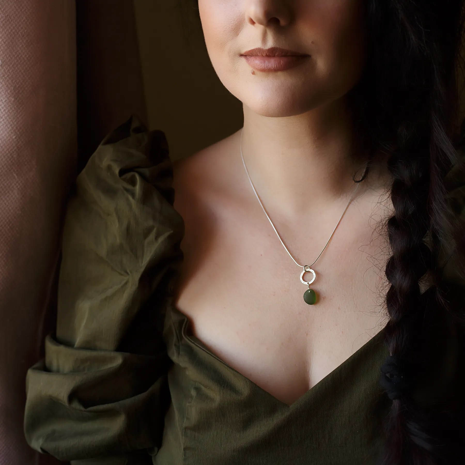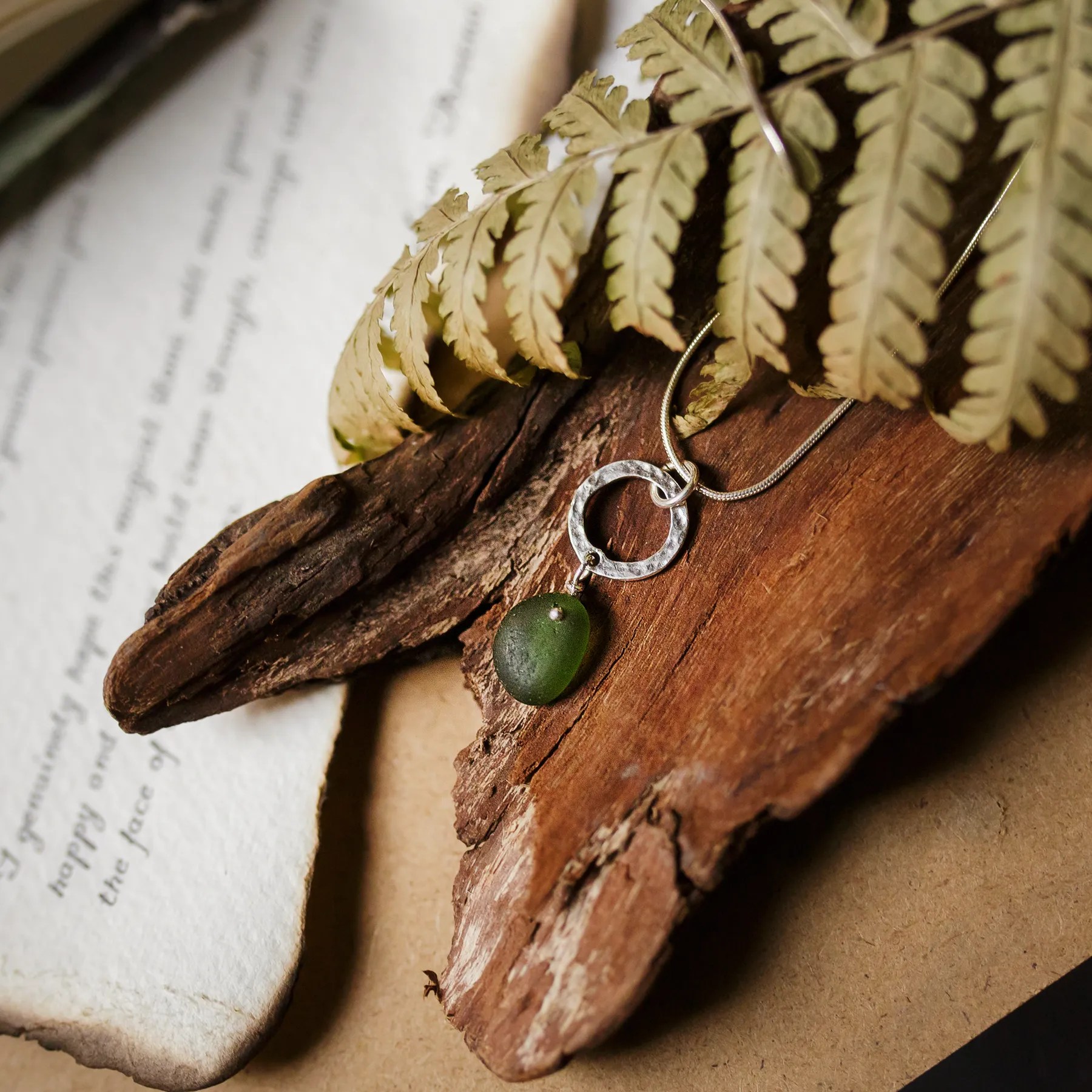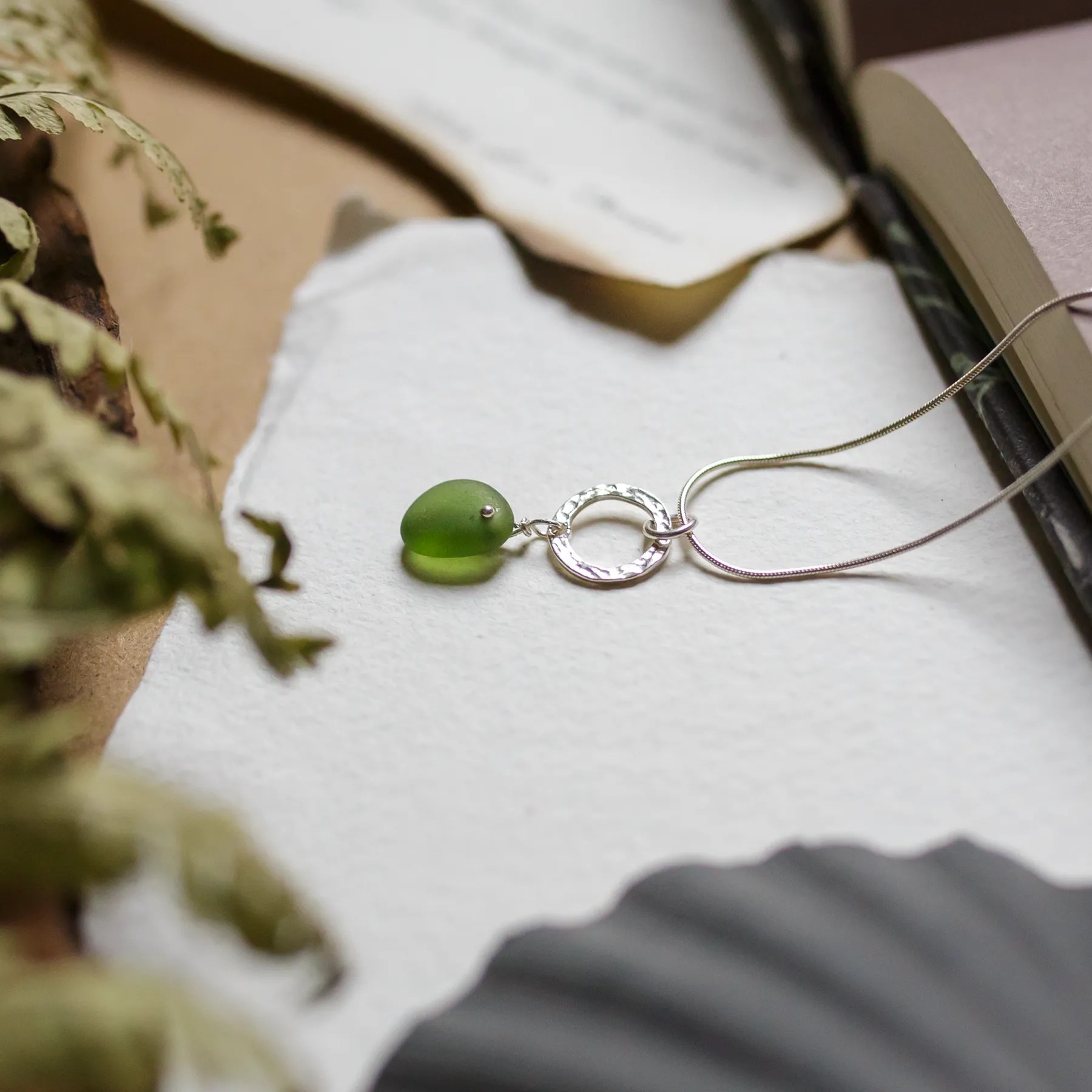 A genuine piece of English sea glass paired with a 925 sterling hammered link, suspended on a sterling silver chain. Every necklace is unique, carrying its own story from the shoreline. This necklace comes with a meaning card & a thoughtful message.