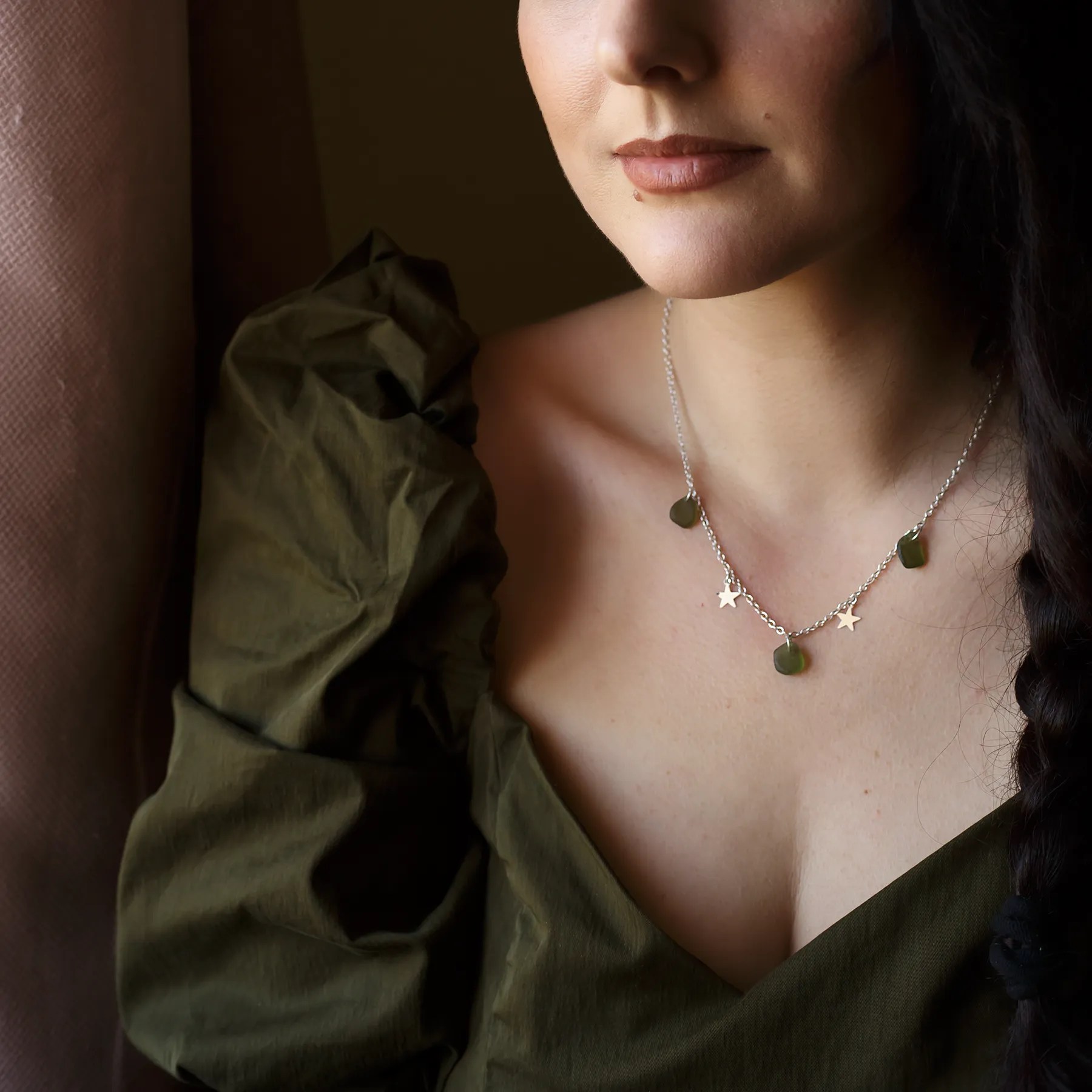 Beautiful, gorgeous piece of  green English sea glass with 925 Sterling Silver star charms, suspended on a 925 Sterling Silver chain.